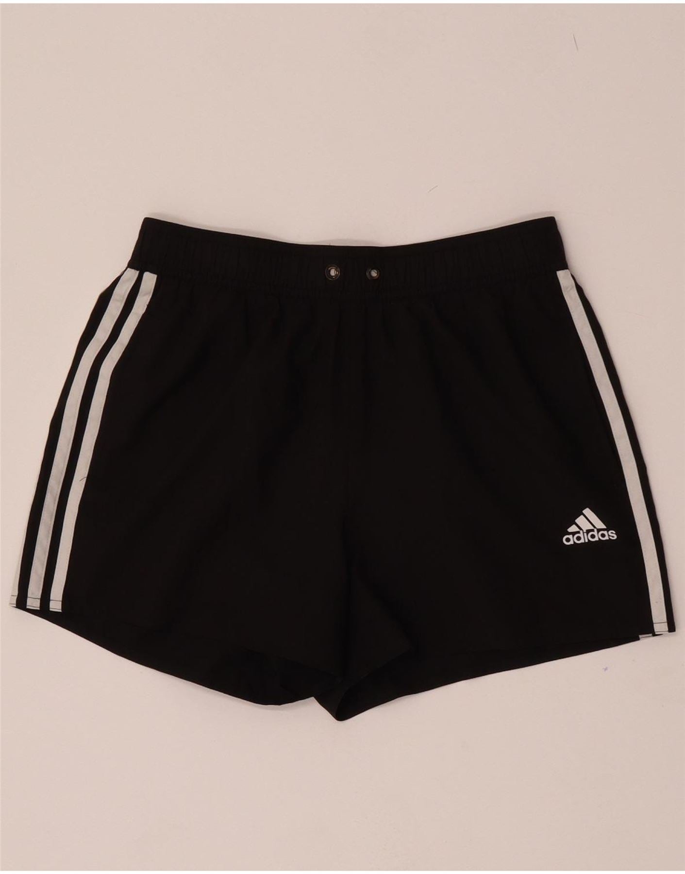 - AI Description: This Adidas womens casual shorts are crafted from black woven polyester, offering a lightweight and breathable feel. The pull on style features an elastic waist for a comfortable, athletic fit. White 3-Stripes detailing runs down the sides, complementing the subtle Adidas logo. These shorts include practical pockets, blending style with functionality for active wear.