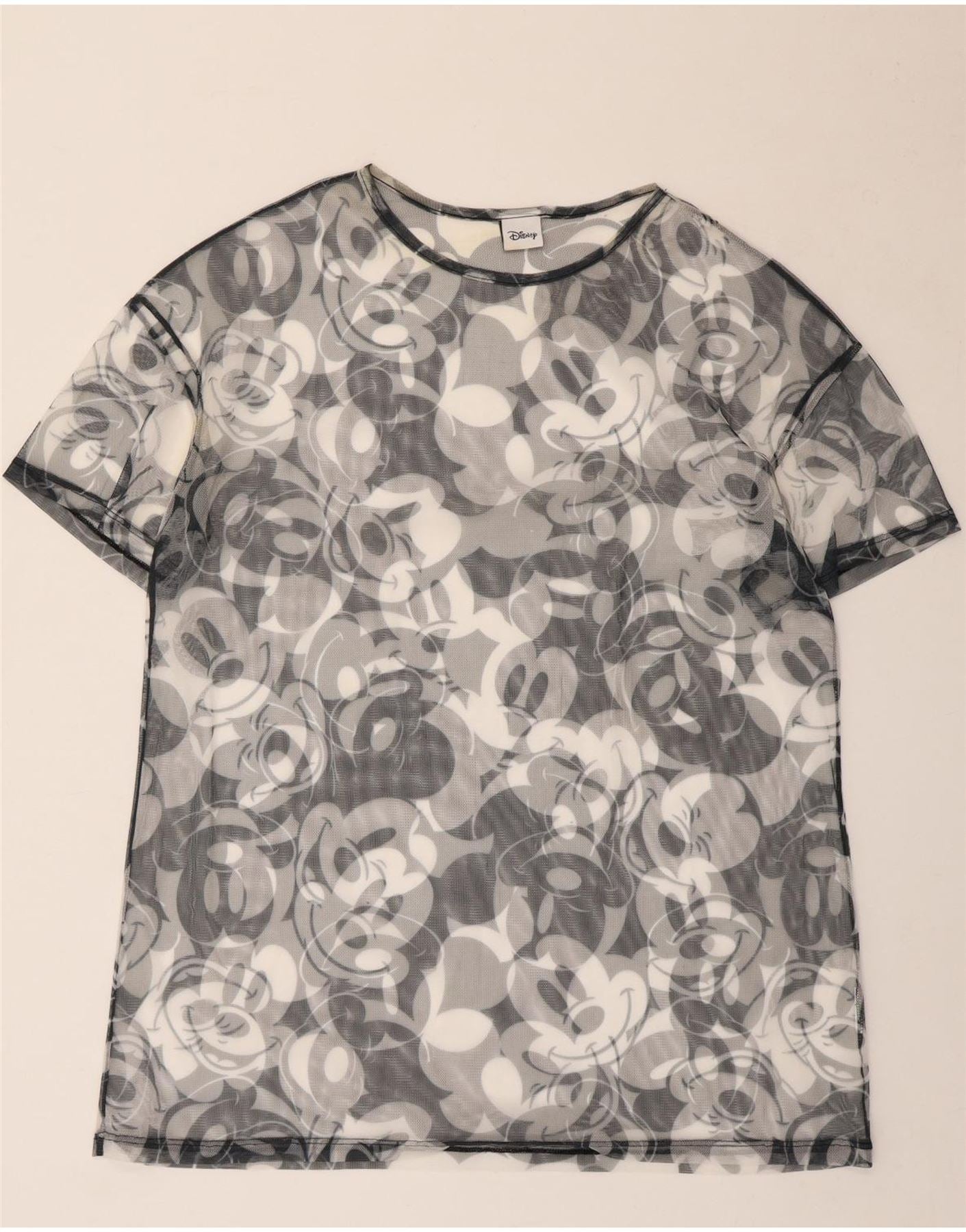 - AI Description: This Disney womens Graphic T-Shirt Top is crafted from a lightweight, transparent mesh fabric. It features a distinctive multicoloured colourblock pattern, showcasing iconic Mickey Mouse motifs in shades of black, white, and grey. The top has a classic round neck and short sleeves. Its regular fit offers a comfortable, contemporary silhouette. This pullover style is perfect for layering, adding a playful touch to any outfit.