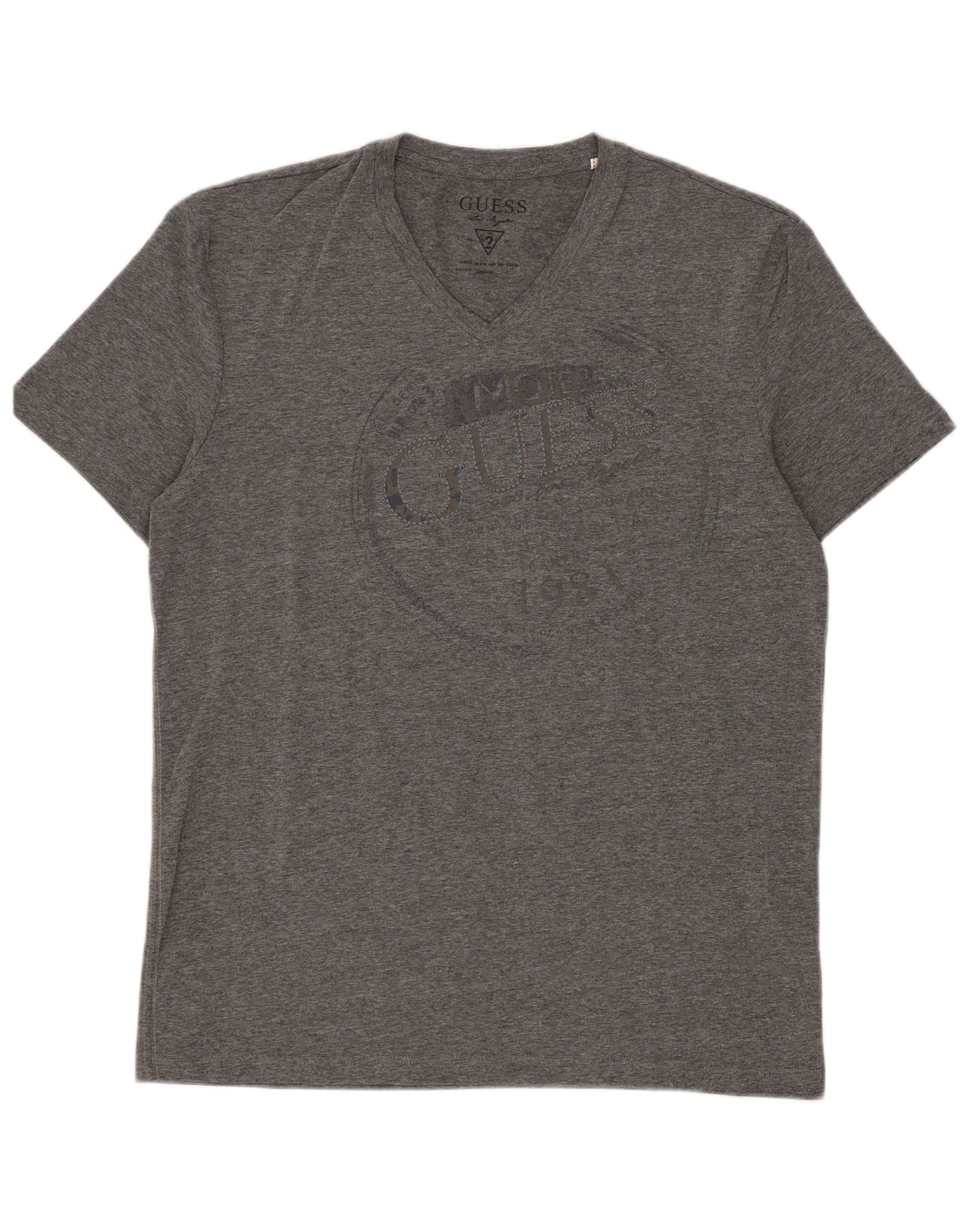 - AI Description: This Guess womens graphic T-shirt top is crafted from a soft grey cotton blend jersey. It features a classic V-neckline and comfortable short sleeves. The regular fit offers a relaxed silhouette. A subtle tonal graphic logo adorns the front, adding a signature touch. This lightweight pullover design provides comfort and stretch for everyday wear.