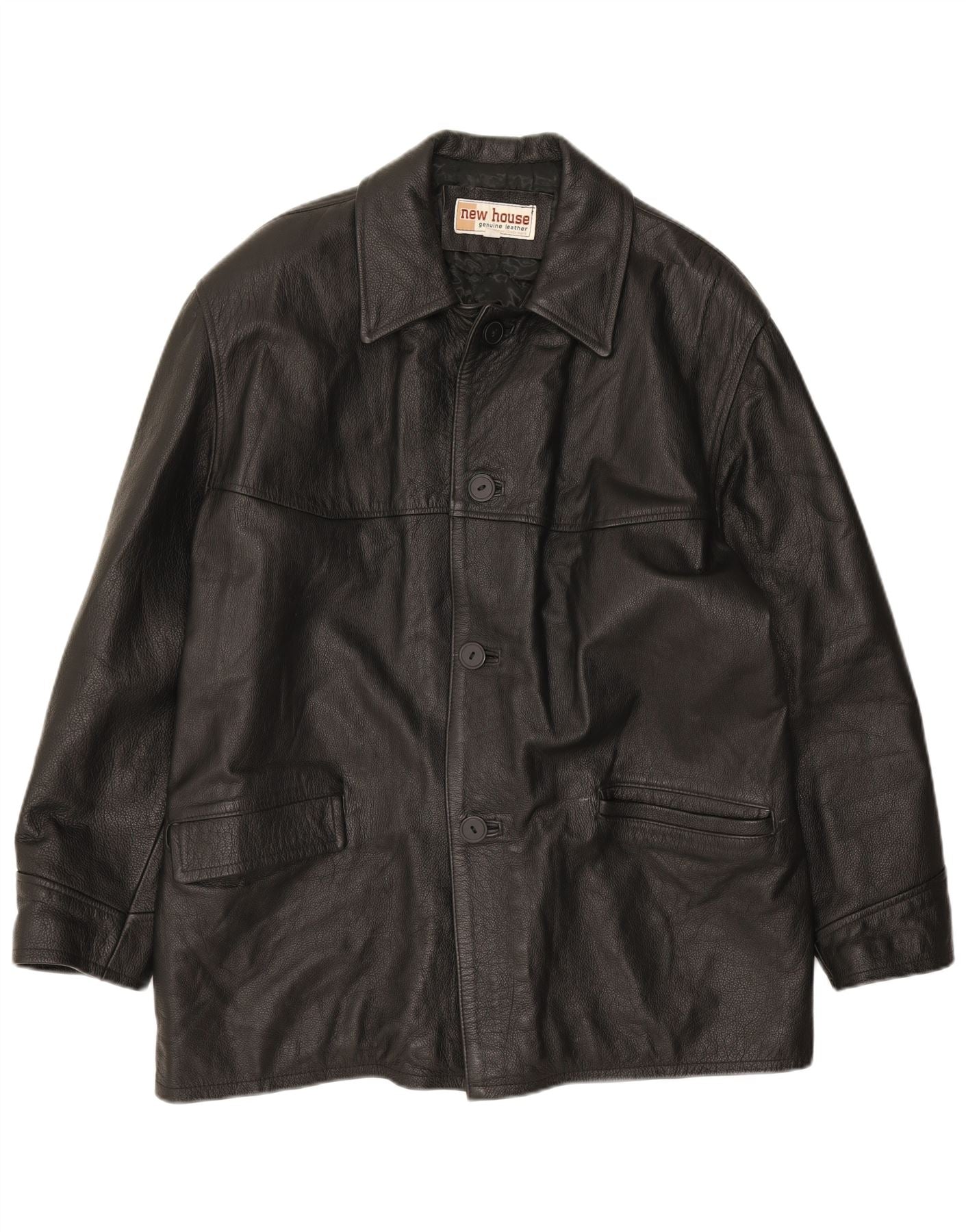 - AI Description: This New House mens leather jacket is crafted from genuine black leather, offering a smooth yet robust texture. It features a classic collared neckline and long sleeves. The regular fit ensures comfortable wear. A three button front closure provides a refined finish. Practical pockets are included for convenience. This timeless piece combines durability with a smart versatile style.