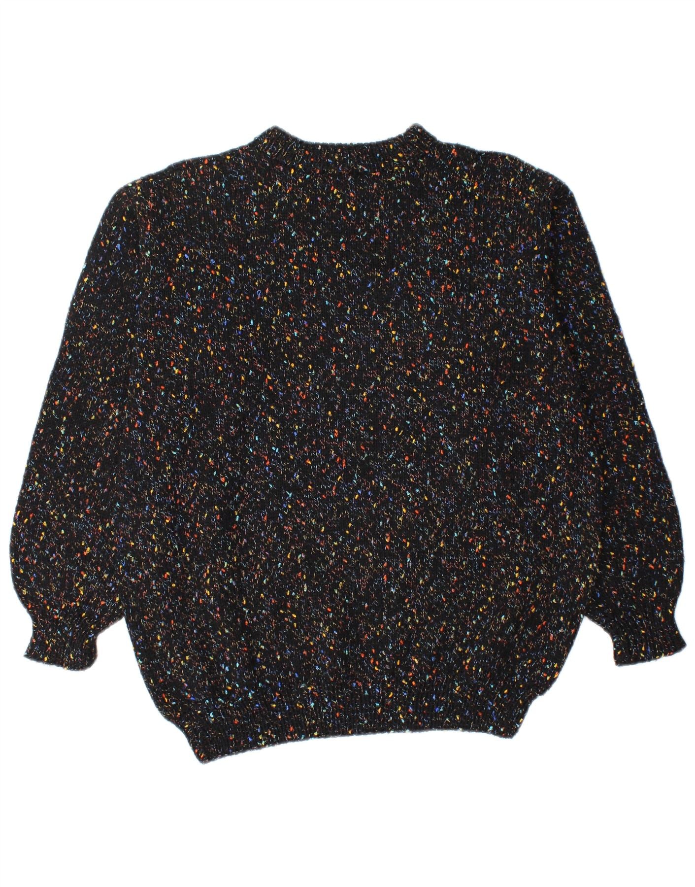 - AI Description: This Vintage mens crew neck jumper sweater is crafted from a black knit fabric. It features a vibrant flecked pattern, creating an abstract, retro look. The round neck and long sleeves offer classic comfort. Its regular fit ensures a relaxed silhouette. This pullover design is perfect for adding a touch of vintage style to any casual outfit.