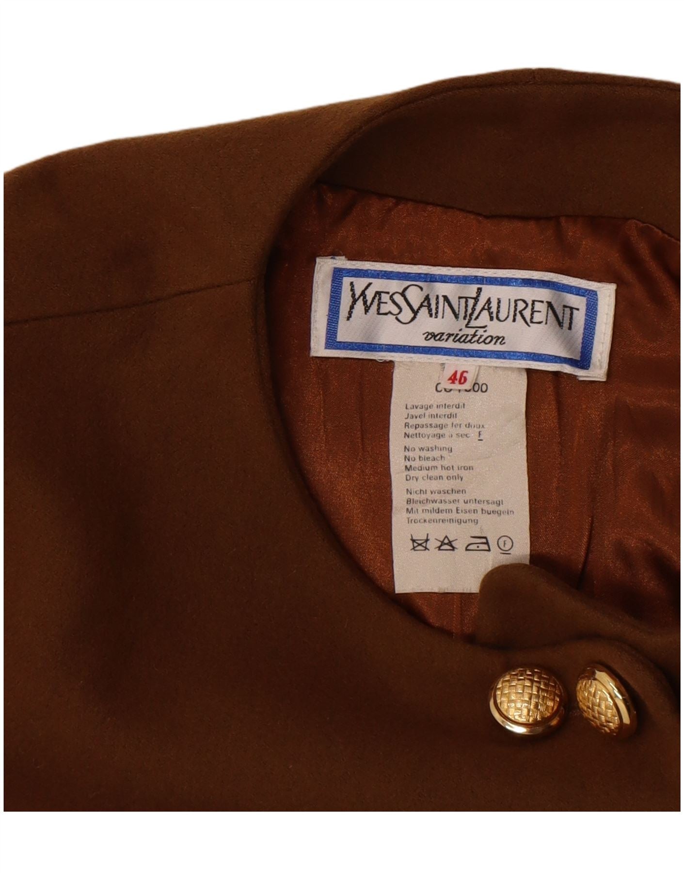 - AI Description: This Yves Saint Laurent womens bolero jacket is crafted from a rich brown woven wool fabric. It features a classic round neck and long sleeves. The cropped length offers a distinctive silhouette. A row of prominent gold-toned buttons fastens the front, adding a luxurious accent. The regular fit ensures a comfortable yet tailored look, perfect for elegant layering.